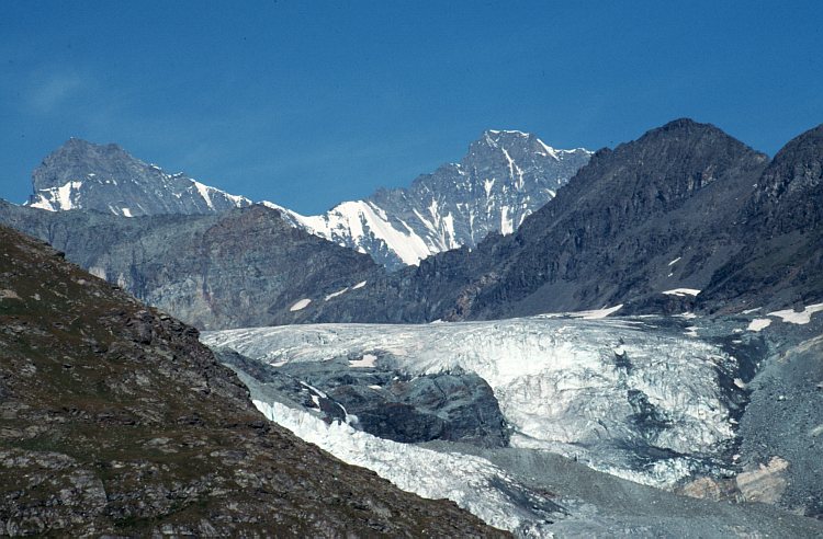 Blick nach Nordwesten über den Hohlabgletscher zum Täschhorn (4490 m) links und dem Dom (4545 m) rechts.