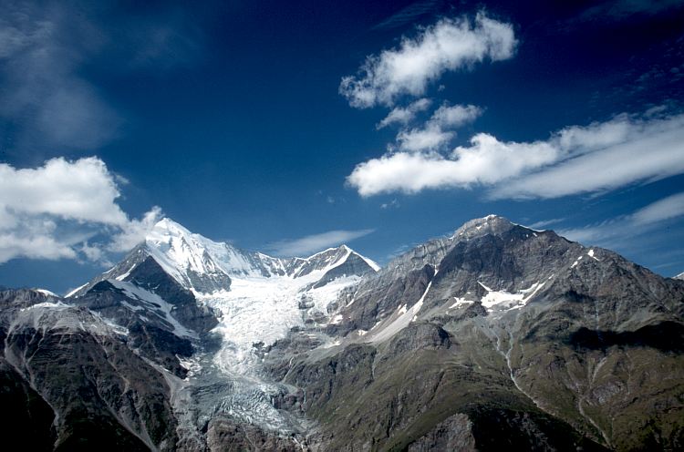 darunter der Bisgletscher. In der Bildmitte das Bishorn (4153 m), ganz rechts das Brunnegghorn (3833 m).