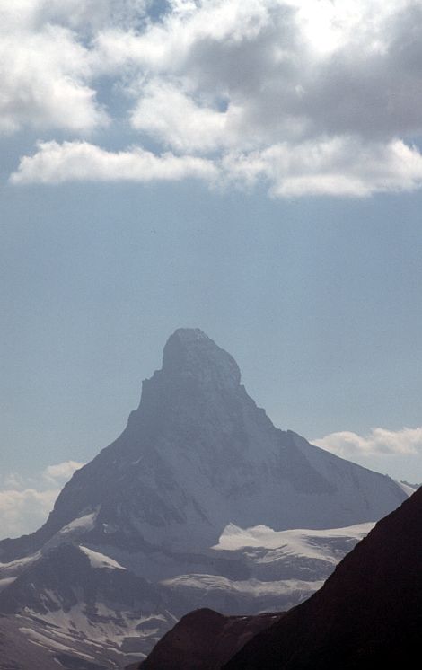 Blick auf das Matterhorn (4478 m) im Abenddunst mit dem Furggrat links und dem Zmuttgrat rechts. Am Fuß der Pyramide der Matterhorngletscher. Standort des Beobachters: Domhütte (2940 m).