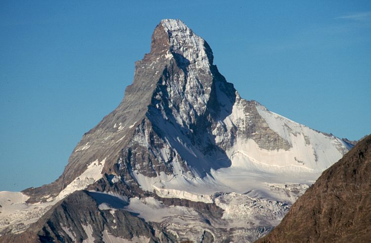 Das Matterhorn (4478 m) von der Domhütte (2940 m) aus gesehen mit seinen 3 Graten Furggrat links, dann Hörnligrat und dem Zmuttgrat rechts. Am Fuß der Pyramide der Matterhorngletscher.