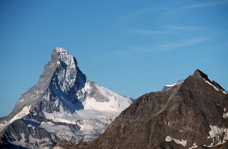 Das Matterhorn (4478 m) von der Domhütte (2940 m) aus gesehen mit seinen 3 Graten Furggrat links, dann Hörnligrat und dem Zmuttgrat rechts. Am Fuß der Pyramide der Matterhorngletscher.
