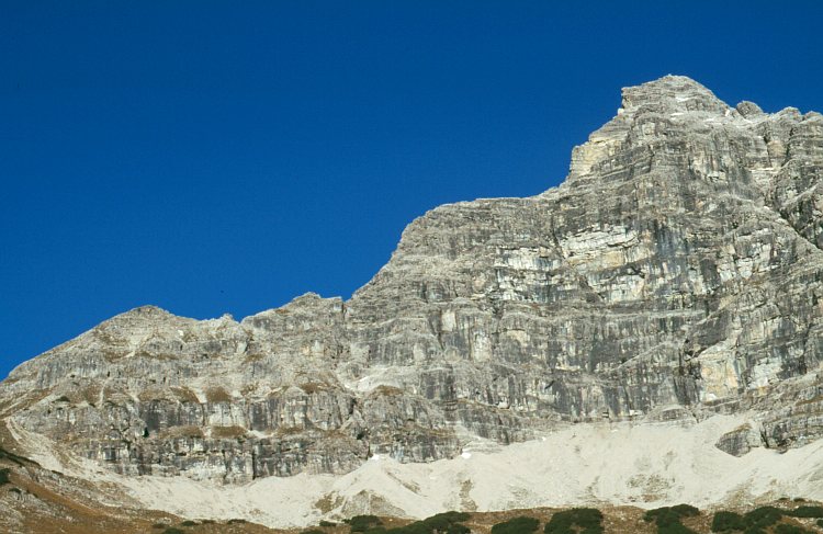 Die sonnenbeschienene Ostflanke des Hochvogels (2592 m). Der Aufstieg verläuft von links über den Südgrat.
