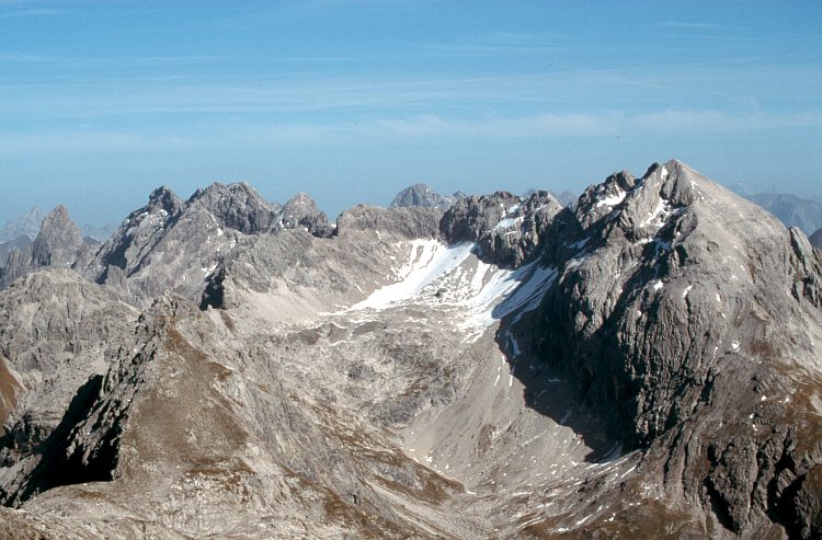 der Große Krottenkopf (2656 m). Oberhalb der Schneefelder im Kar der Wilde Mann (2577 m)
