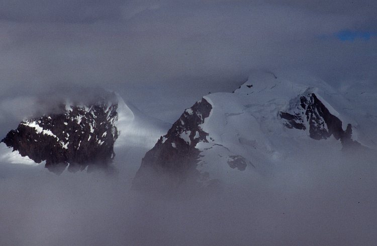 Von der Weissmiesgruppe geht der Blick hinüber zum Rimpfischhorn (4199 m) links und dem Allalinhorn (4027 m) rechts. Vom Allalinhorn kommt der Hohlaubgrat herab, daneben der Hohlaubgletscher.