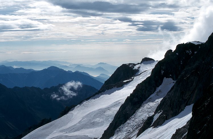 Blick vom Zwischbergenpass (3268 m) nach Osten. Rechts unten der Zwischbergengletscher, darüber die Bergflanken des Portjenhorns (3567 m).