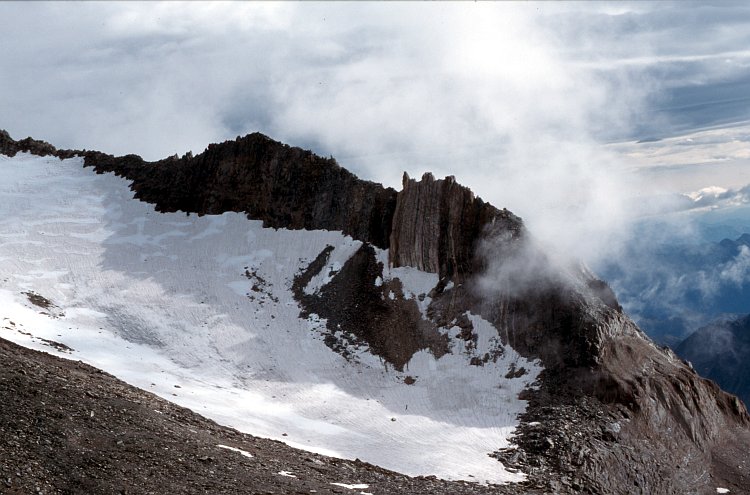 Blick vom Zwischbergenpasses (3268 m) auf den hier auslaufenden Südgrat der Weissmies (4023 m).