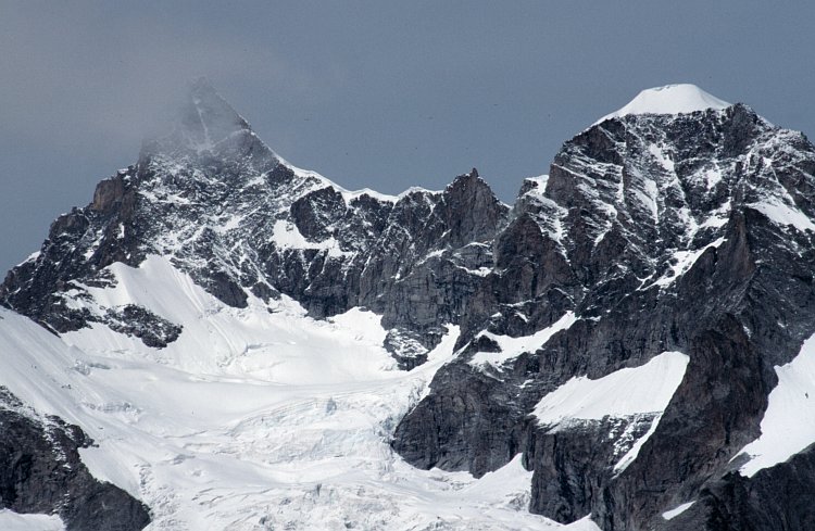 Das Obergabelhorn (4063 m), rechts die Wellenkuppe (3903 m). Davor der Gabelhorngletscher.