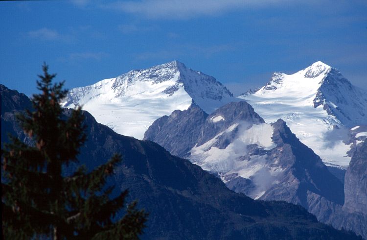 Blick nach Südwesten auf die Wetterhörner. Rechts das Mittelhorn (3704 m) und links das Rosenhorn (3698 m). Vorne unten das Gadmertal, hinter dem Grat das Haslital, das nach links zum Grimsel hinaufzieht.