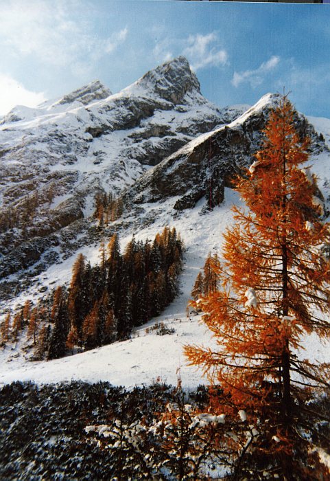 Im Hintergrund der Fallenbacher Turm (2704 m), knapp rechts daneben in der Bildmitte die Fallenbacher Spitze (2723 m). Blick durch das Alperschon Tal.