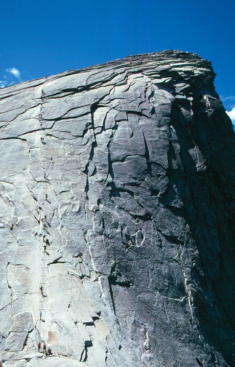 Der Half Dome (2695 m). Die Gipfelschulter erscheint schuppenartig, Seile erleichtern den Aufstieg.