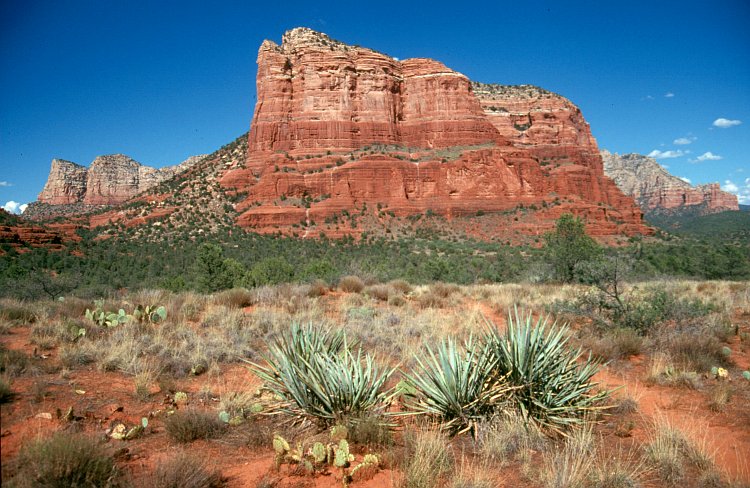 Der Oak Creek Canyon im Coconino National Forest, nur wenig südlich von Flagstaff, Arizona. Am Ausgang des Canyons imposante Felsformationen wie hier der Courthouse Butt.