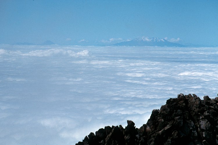 Mount Egmont (2517 m), Gipfel. Blick nach Osten , in über 100 km Entfernung rechts Mount Ruapehu und links Mount Ngauruhoe im Tongariro National Park.