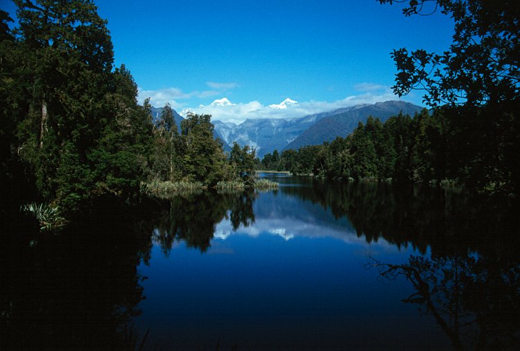 Links Mount Tasman (3498 m), rechts Mount Cook (3754 m), davor Lake Matheson.