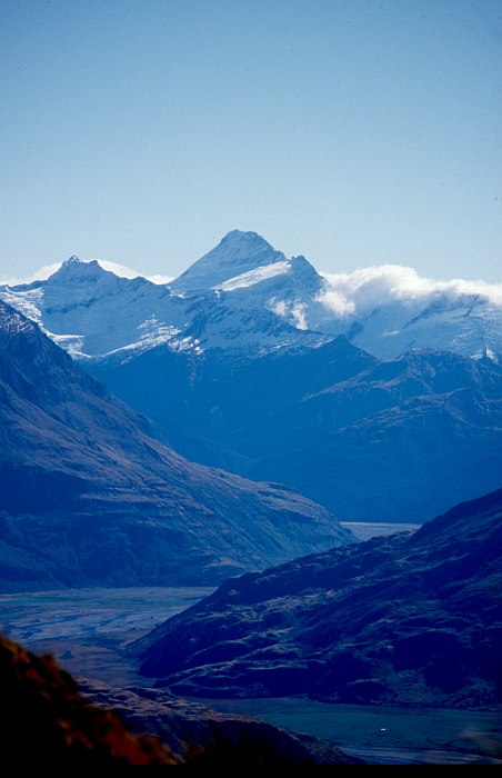 Links Mount Avalanche (2590 m), in der Mitte Mount Aspiring (3030 m), knapp rechts davor Pope's Nose (2691 m). Im Vordergrund das Tal des Matukituki River.
