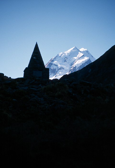 Hinter dem Alpine Memorial der Mount Cook (3754 m) mit dem Low Peak (3593 m) und dem Middle Peak (3722 m).