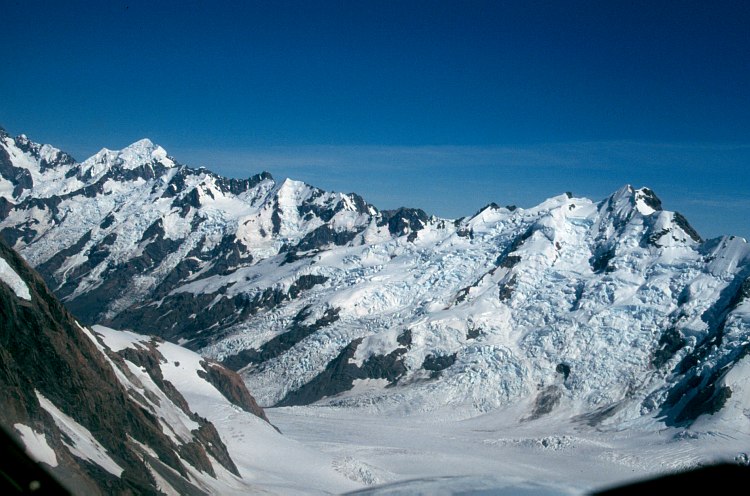 Unten der mächtige Tasman Glacier und im Hintergrund der Mount Tasman (3498 m).