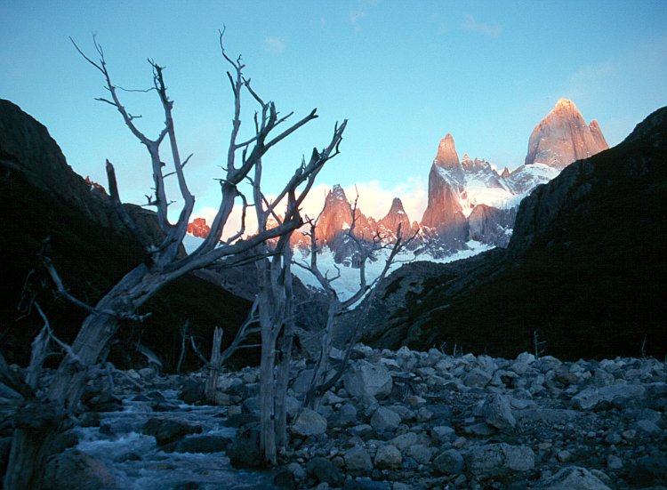 von links: Cerro Mojón Rojo (2163 m), A. Saint Exupery (2558 m), A. Rafael (2482 m), Cerro Poincenot (3002 m) und Monte Fitz Roy (3405 m)