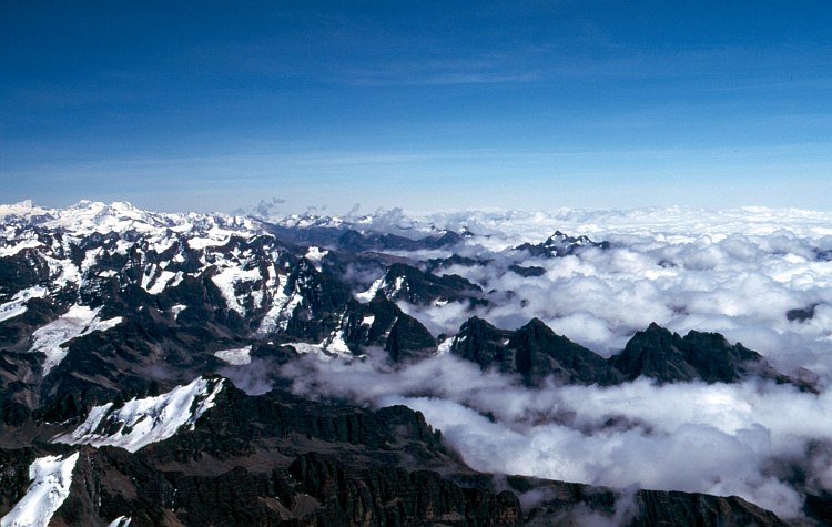 Huayna Potosí (6088 m); Blick nach Norden auf den Verlauf der Cordillera Reál, rechts die feuchten Yungas.