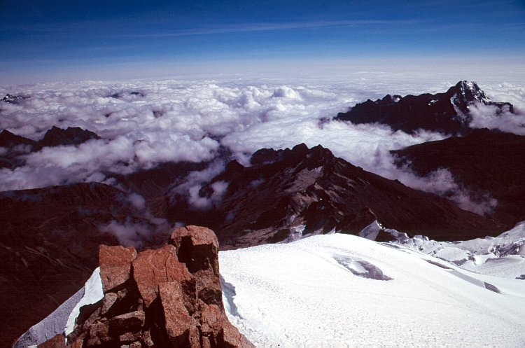 Gipfelbereich des Huayna Potosí (6088 m) mit dem Cerro Illampu (5529 m) im Osten.